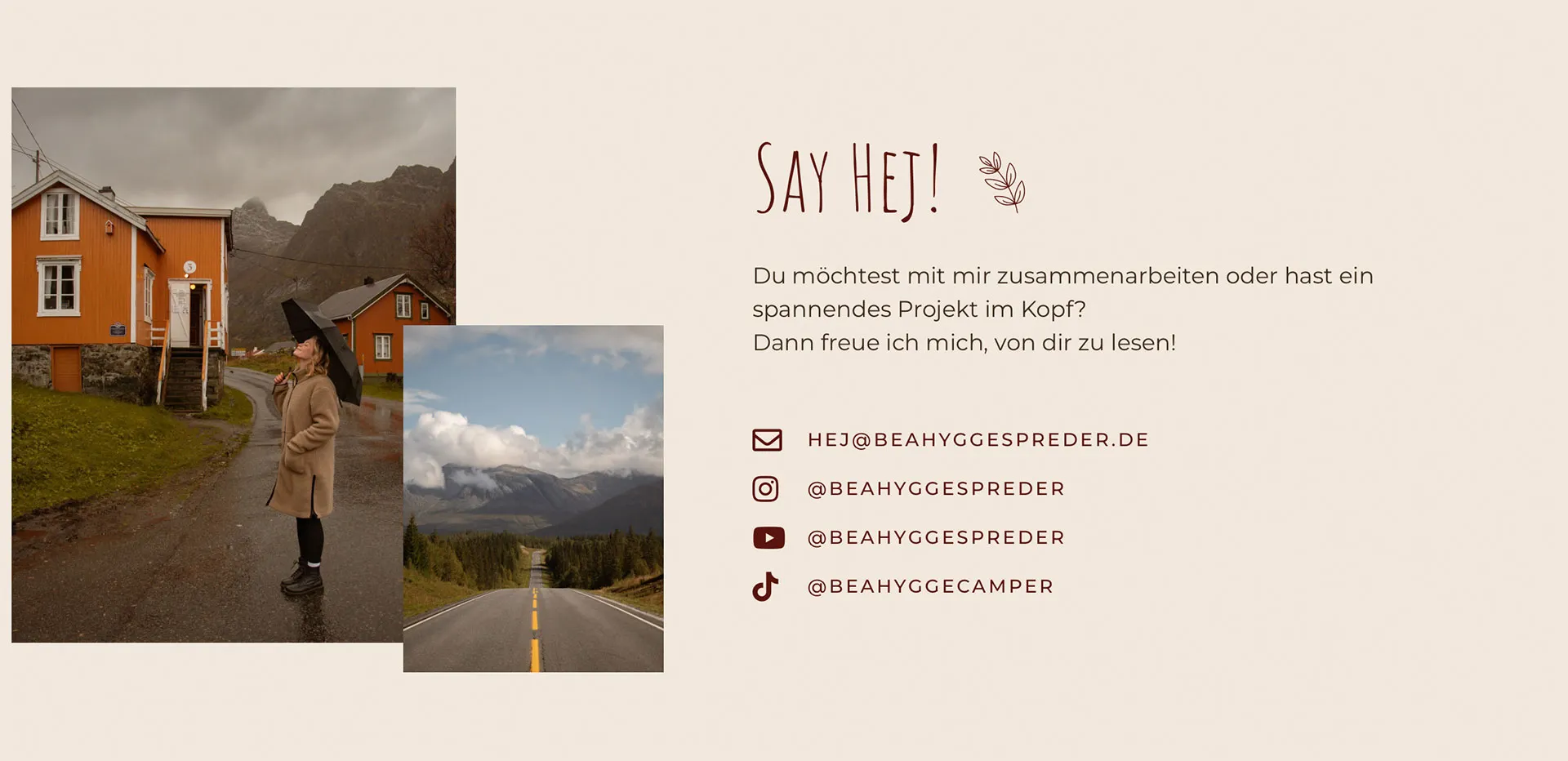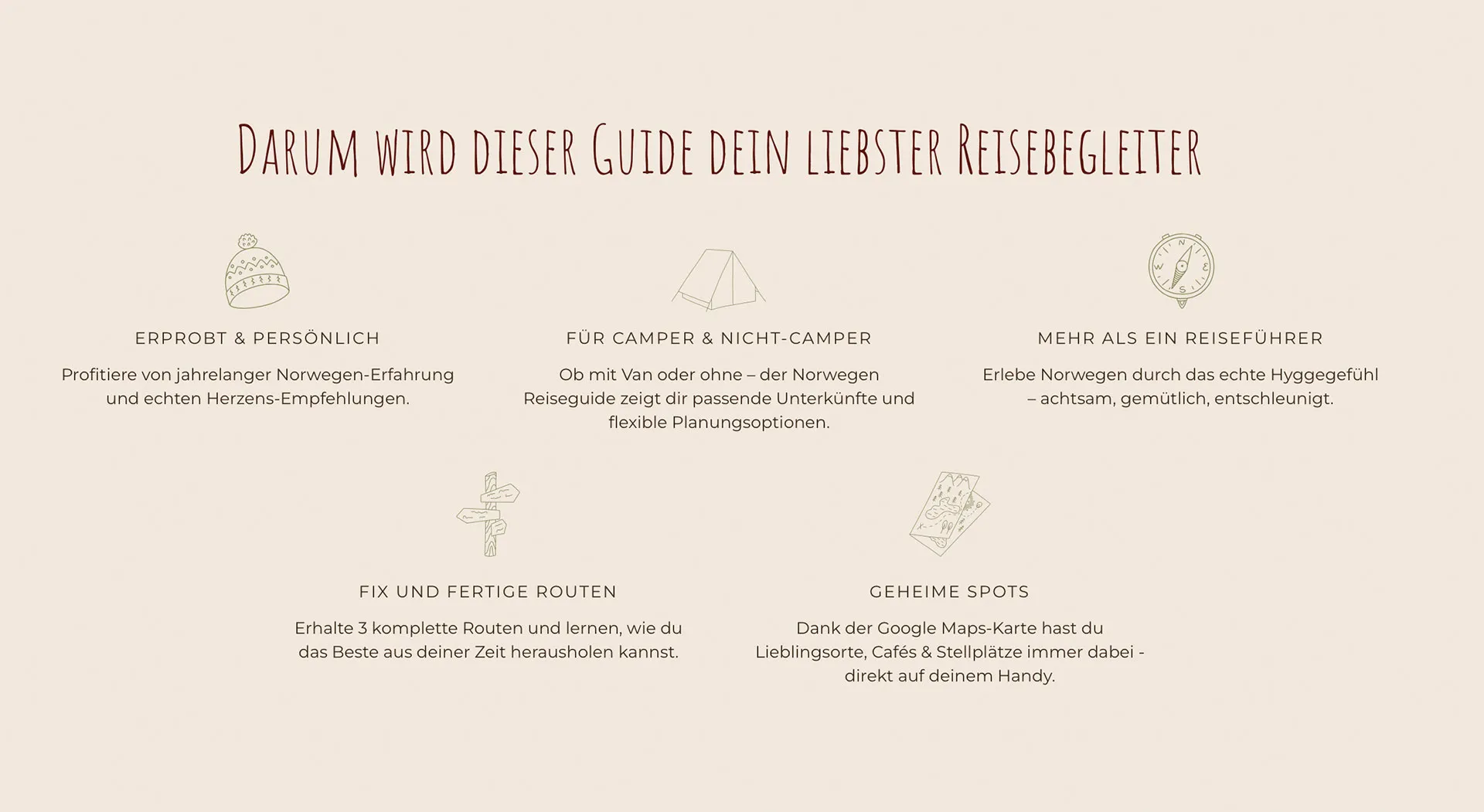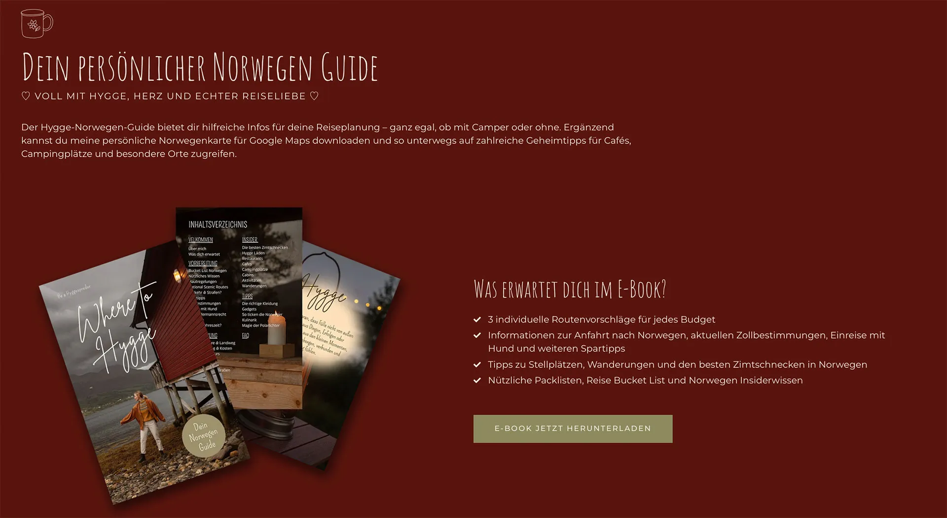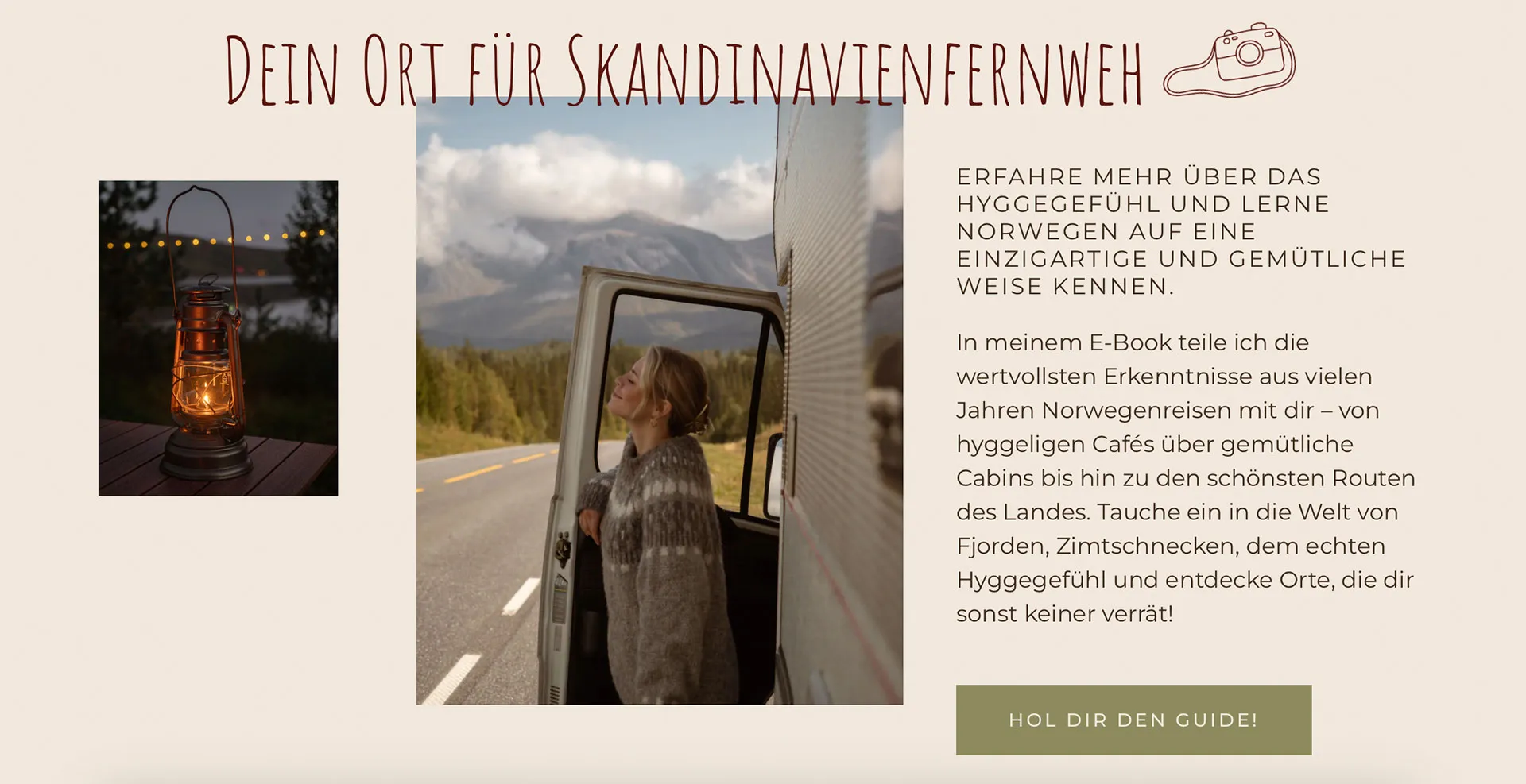 Vanessa liebt Norwegen – seit ihrer Kindheit, jedes Jahr vor Ort, das Hyggegefühl durch und durch gelebt. Ihr Wissen, ihre Tipps und ihre Leidenschaft hat sie in einem eigenen Reiseguide festgehalten. Was noch fehlte: ein hochwertiger Markenauftritt, der das Projekt so präsentiert, wie es verdient. Und der es ein Stück weit unabhängig von ihrer Content Creation auf Instagram macht.
