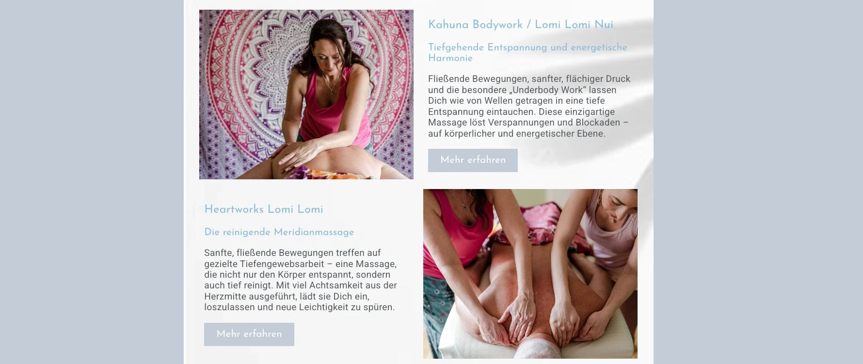 Der Branding Workshop begann mit einer zentralen Erkenntnis: Sonja verkauft keine Massagen. Sie vermittelt Transformation. Die hawaiianische Philosophie der 7 Huna Prinzipien, die Verbindung von Körper, Geist und Seele, das Bild der Massage als Seelentanz – all das steckt in ihrer Arbeit. Die Herausforderung war, das greifbar zu machen. Für Menschen, die vielleicht noch nie eine Kahuna Massage erlebt haben. Für Menschen, die unsicher sind, was sie erwartet. Und für Menschen, die einfach nach etwas suchen, das sie wirklich berührt. Ein großes Thema war Vertrauen. Sonja arbeitet in einem Bereich, der Nähe erfordert – körperlich und emotional. Die Kommunikationsstrategie wurde bewusst so entwickelt, dass sie Vorurteile abbaut, Nähe schafft und zeigt: Hier bist du in guten Händen. Persönliche Vorstellungen der Teammitglieder, klare Abläufe, ein offenes Erstgespräch – all das wurde als Teil der Markenkommunikation verankert. Die Website wurde als einladender Ort konzipiert: warm, klar, mit Raum für Tiefe. Sonjas Philosophie bekommt ihren Platz, ihre Angebote werden verständlich strukturiert, und die Specials – von Pop-Up-Workshops bis zum Event auf Mallorca – finden sich unter dem Prinzip MANAWA: Jetzt ist der Moment der Kraft.