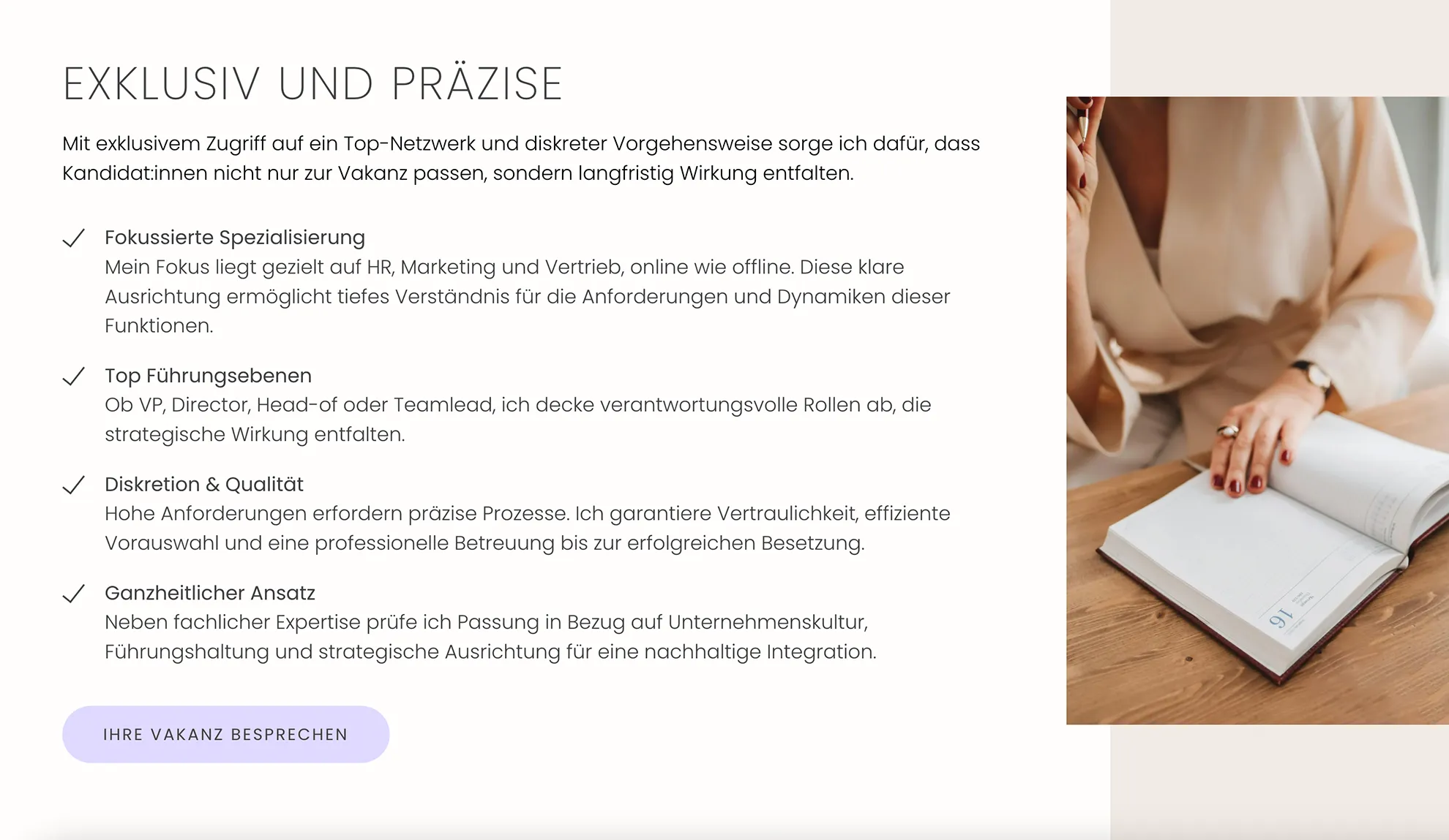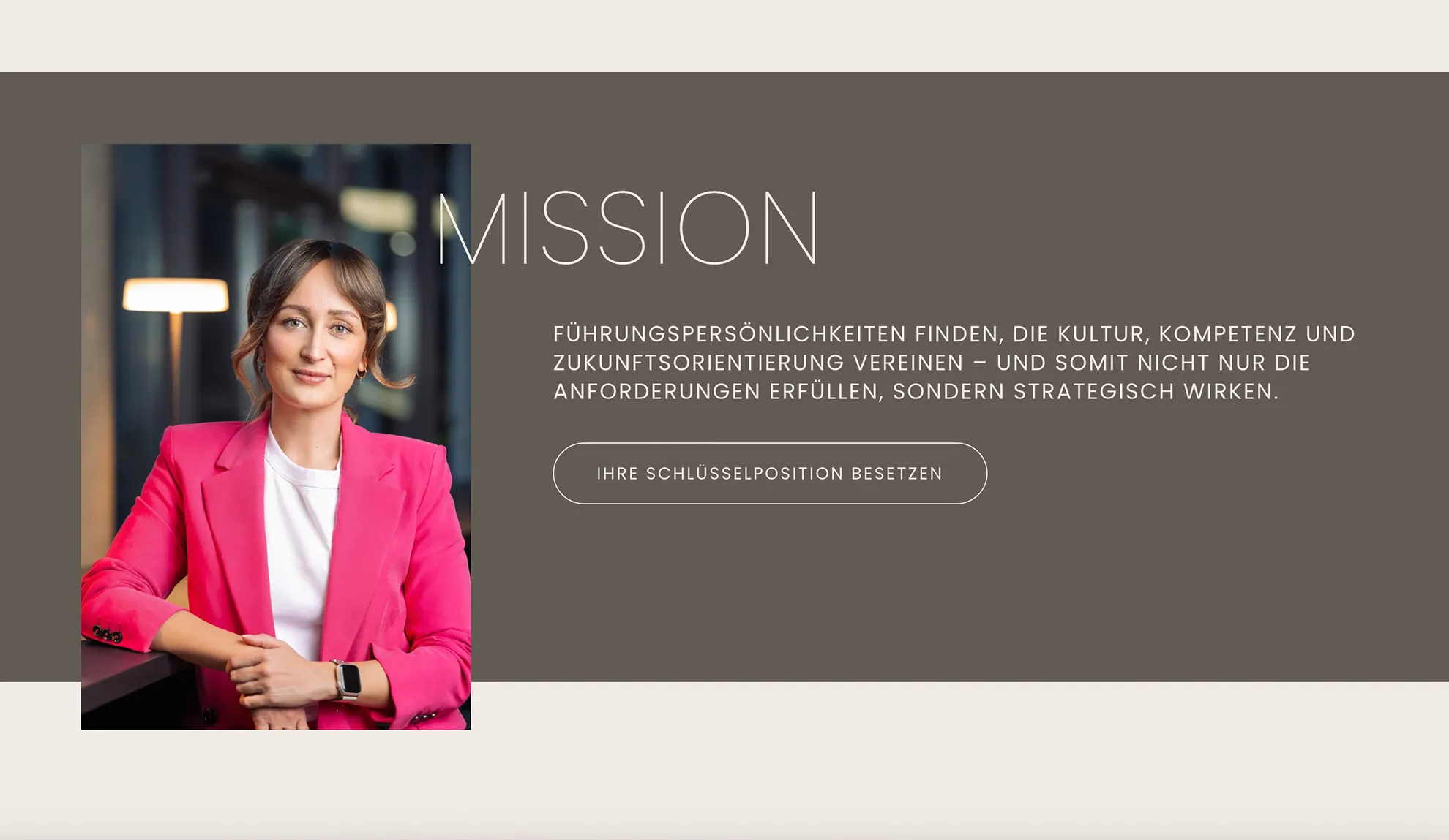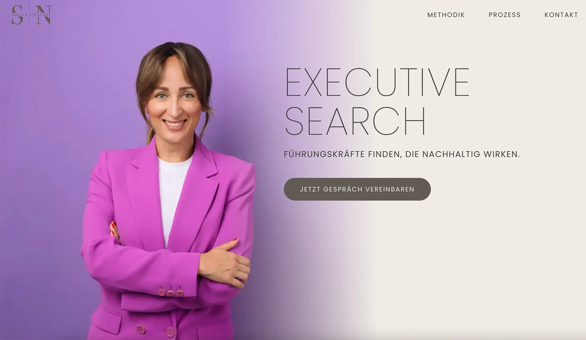 Nabila Staschel ist als Executive Search & Personalberaterin mit exklusiven Großkunden aus Mode und Lifestyle tätig. Ihre bisherige selbstgebaute Mini-Website zeigte weder ihre hochwertige Arbeit noch ihre Persönlichkeit authentisch. Für ihr neues Online-Zuhause wünschte sie sich eine Balance aus Farbe und Minimalismus, Seriosität und Persönlichkeit sowie Ästhetik und Bodenständigkeit.